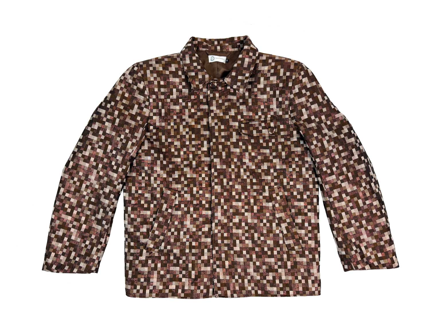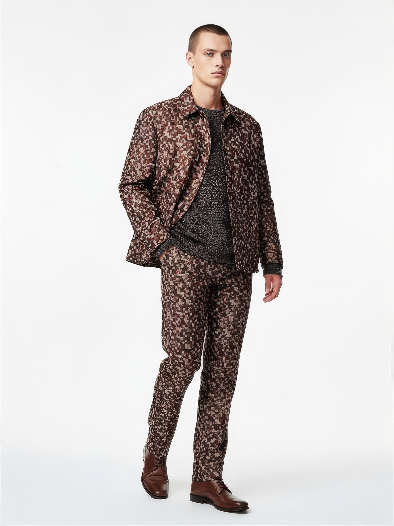 Der Jacquardstoff zeigt ein vielschichtiges Pixelmuster in Rot-, Braun- und Grautönen, durchzogen von glänzendem Lurexfaden. Das Ergebnis ist eine Struktur, die sowohl an digitale Pixelwelten als auch ein wenig an Jugendstilornamente erinnert – mit einem eleganten, subtilen Glanz.
